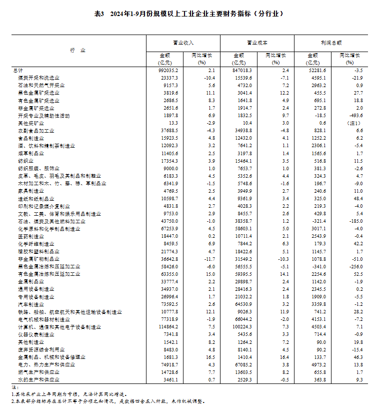 1—9月份,采礦業(yè)實(shí)現(xiàn)利潤總額8963.8億元,同比下降10.7%;制造業(yè)實(shí)現(xiàn)利潤總額37325.0億元,下降3.8%;電力、熱力、燃?xì)饧八a(chǎn)和供應(yīng)業(yè)實(shí)現(xiàn)利潤總額5992.9億元,增長12.1%。