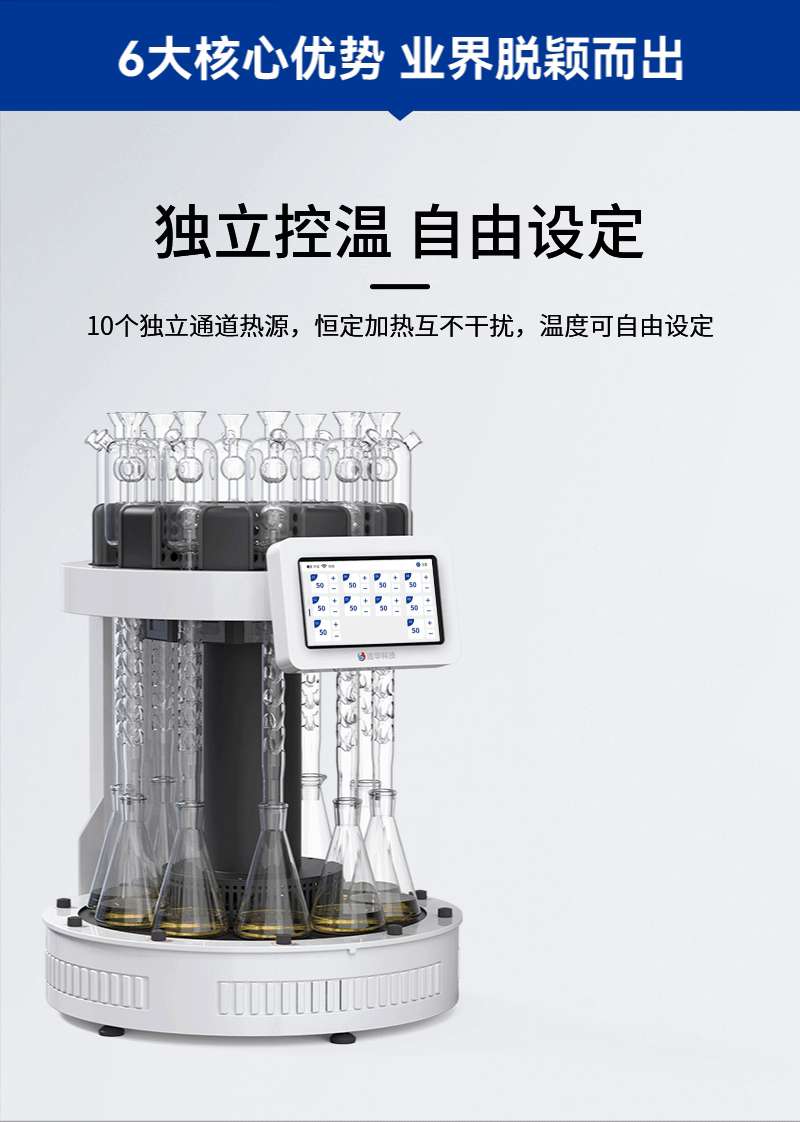 1、獨立控溫:10個獨立通道熱源,各通道恒定加熱,互不干擾,每個加熱單元可根據水樣特性自由設置消解溫度,保障樣品達到標準要求的微沸狀態;