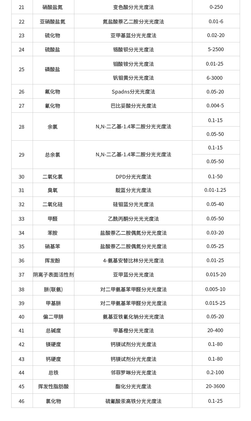 1、46項指標:直接測定化學需氧量(COD)、氨氮、總磷、總氮、懸浮物、色度、濁度、重金屬、有機污染物和無機污染物等多項指標,濃度直讀;